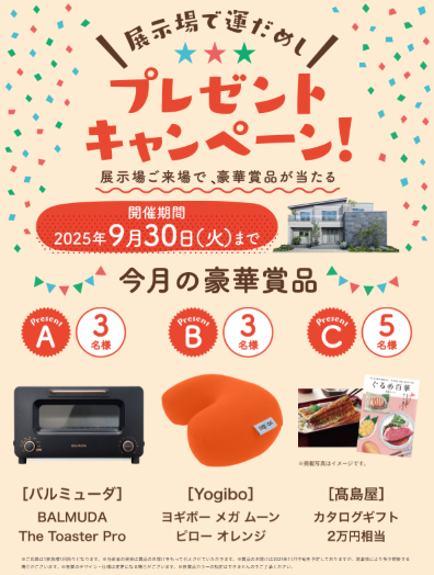 展示場ご来場で豪華賞品を抽選にてもらえるチャンス! WEB予約でさらに最大QUOカード6,000円プレゼント!!