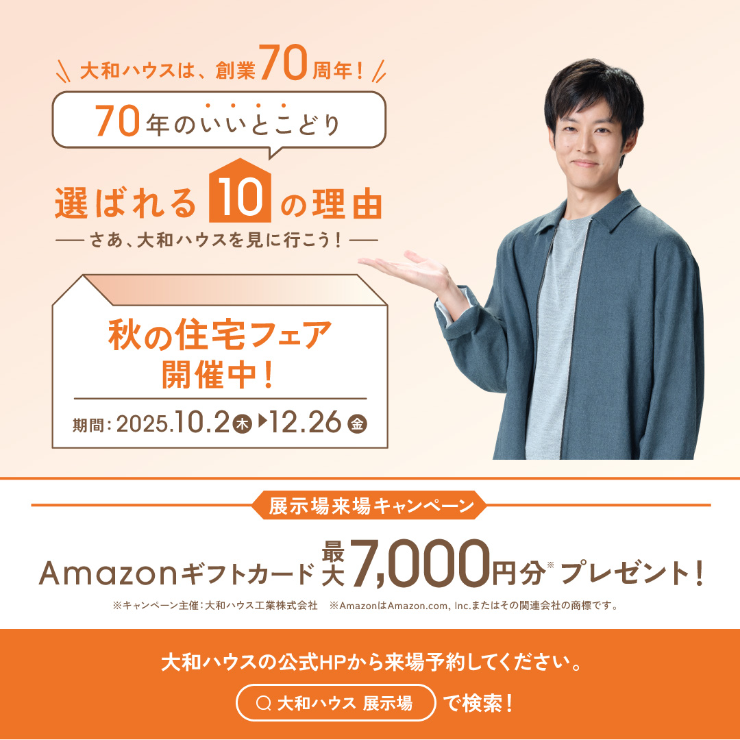 2025 年 10 月 2 日~12 月 26 日の期間中、大和ハウスの公式 WEB サイトから「住宅展示場」にご予約の上、ご来場いただいた方には「Amazon ギフトカード 4,000 円分」をプレゼント。さらに、各種相談(AI プラン診断、ファイナンシャルプランナーによるライフプラン相談(無料)、土地の敷地調査、物件見学、建物見学)の次回の商談を予約&実施いただいた方には「Amazon ギフトカード 3,000 円分」をプレゼントします。