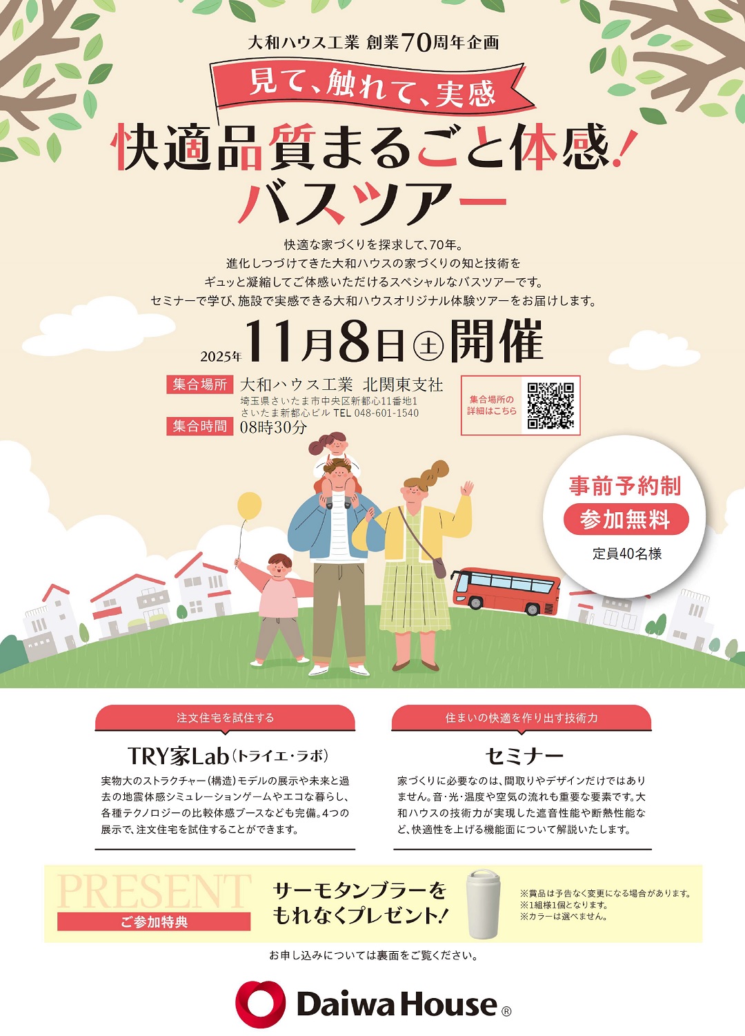 快適な家づくりを探求して70年。進化しつづけてきた大和ハウスの家づくりの知恵と技術をギュッと凝縮してご体感いただけるスペシャルなバスツアーです。