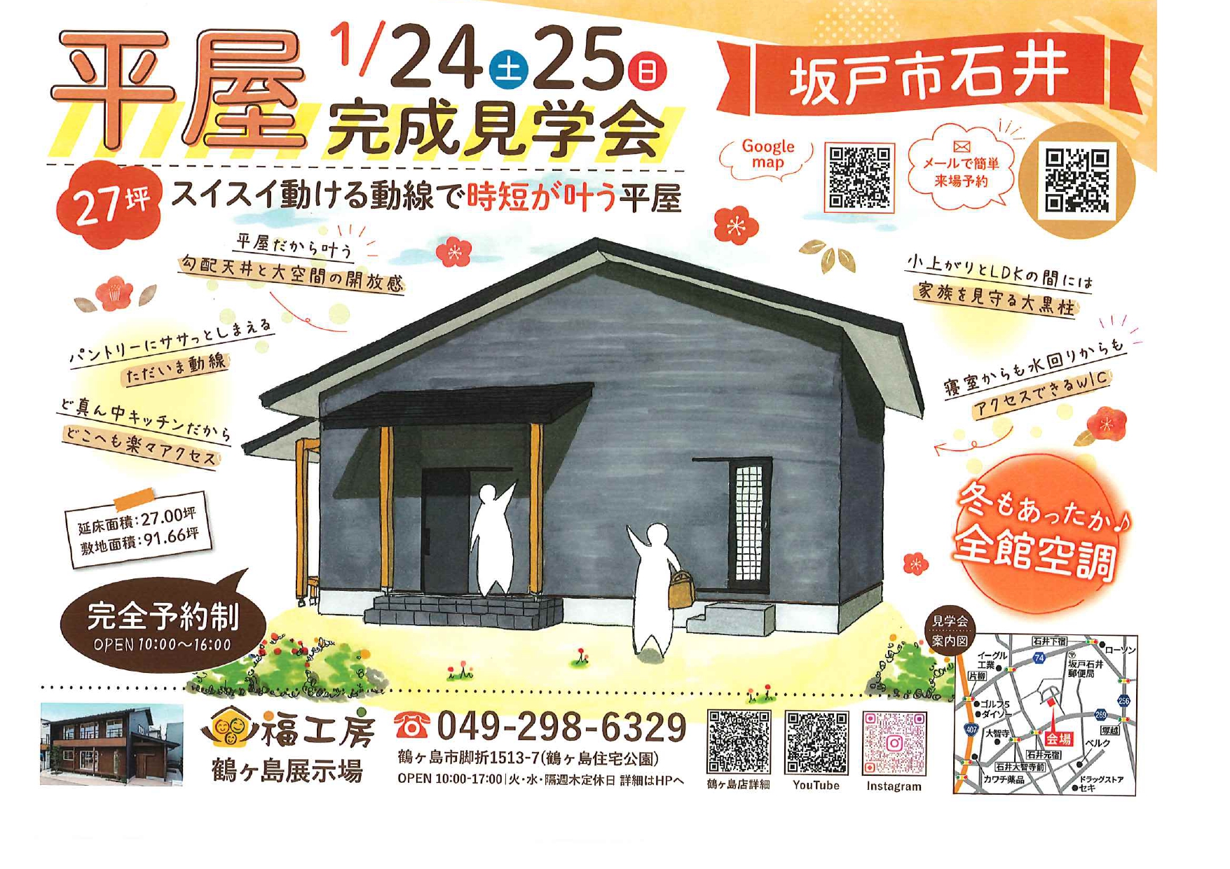 ご夫婦で住まう27坪のリアルサイズの平屋見学会です。時短で家事をするために、水回りの回遊動線にこだわりました。注文住宅のリアルなおうちを見ることで、イメージがつきやすいと思います。展示場だと住んだ時のイメージがわかない!という方はぜひお越しください。予約をしていただければスムーズにご案内できます。